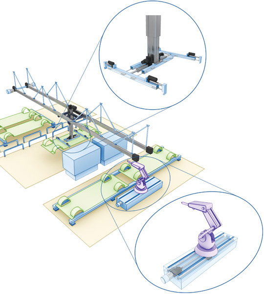 物料搬運解決方案有時起到將無法相鄰布置的生產單元串連起來的作用。在這些單元之間移動貨物、零配件,意味著就要用速度來彌補距離,但不能妨礙其他流程。高架運輸就是一種解決這個問題的方案,這樣貨物就不會占用人行道或叉車道,從而為其他生產設備騰出寶貴的地面空間。