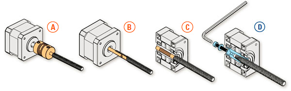 將電機固定到梯形絲杠上通常需要耦合器總成 (A)、沉孔壓配合 (B) 或空心軸壓配合 (C)。 組裝流程可能還需要使用 粘合劑或焊接,但結果就是所有這些解決方案將造成難以或無法更換梯形絲杠 或進行維護。 通過正在申請專利并只需要一個固位緊固件的錐形鎖套耦合器 (D),Thomson 已成功解決這一問題。 您可利用這項全新設計輕松進行維護或梯形絲杠的更換。