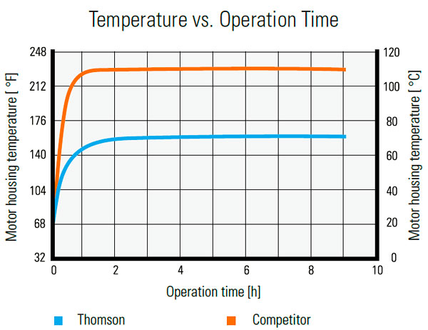 由于 Thomson 的電機效率更高,因此可在更低熱損耗的條件下輸出更多扭矩,這意味著我們的電機可在更高的輸入功率下運行,同時減少熱量產生。
