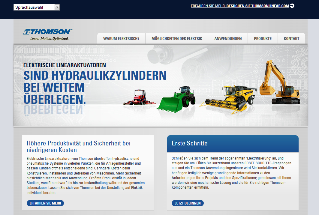 Zur Aufbereitung dieser neuen Informationsquelle griff Thomson auf seine umfassenden Kenntnisse in diesem Bereich zurück. Die in Deutsch, Englisch und Chinesisch verfügbare Microsite zeigt im Detail, inwiefern elektromechanische Lösungen in mobilen Arbeitsmaschinen für Baustellen, Straßenreparaturen, die Land- und Forstwirtschaft oder im Garten- und Landschaftsbau signifikant niedrigere Betriebskosten ermöglichen, den Planungs- und Montageaufwand reduzieren sowie zu mehr Sicherheit für den Bediener und zur Produktivität beitragen.