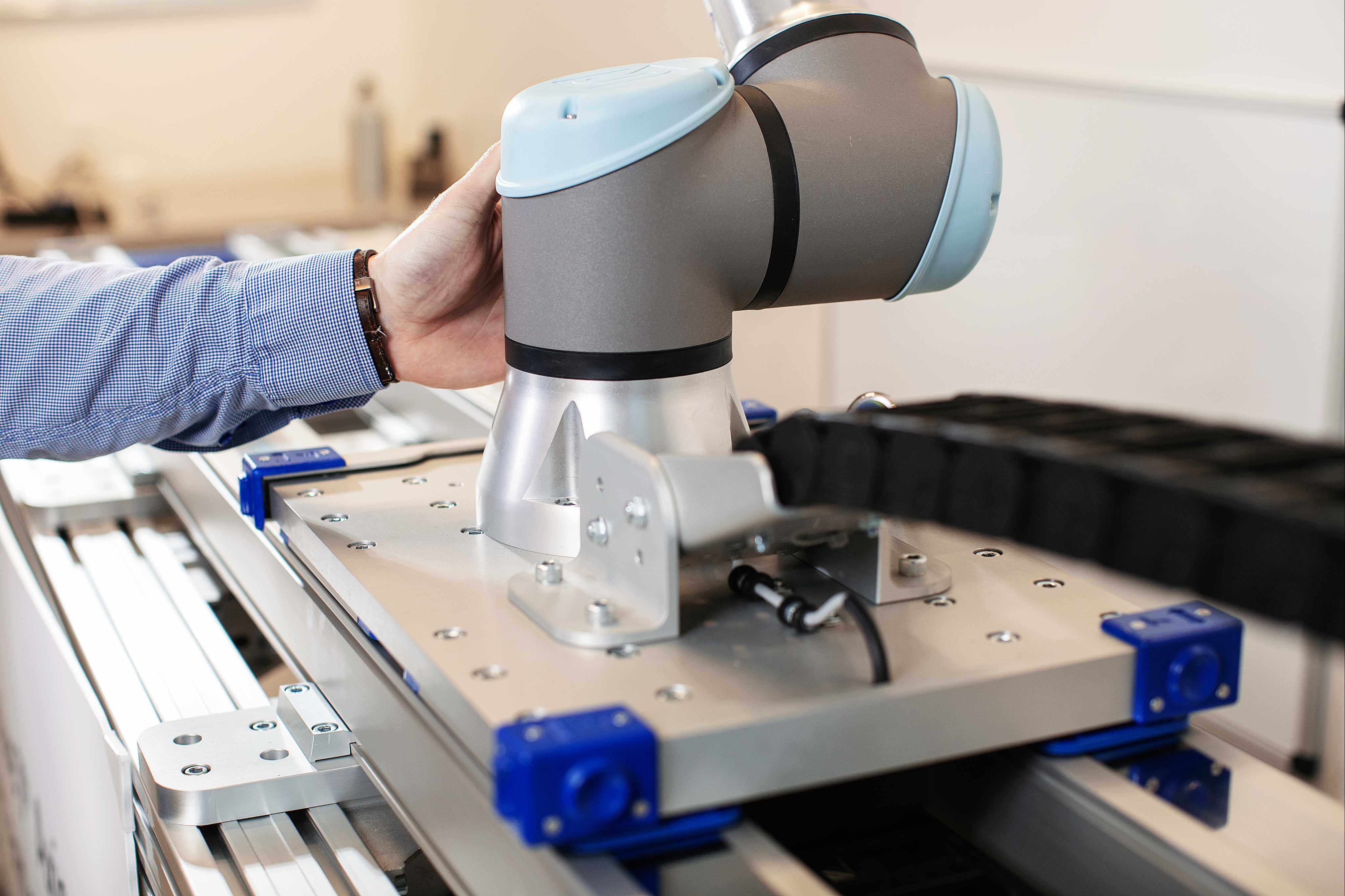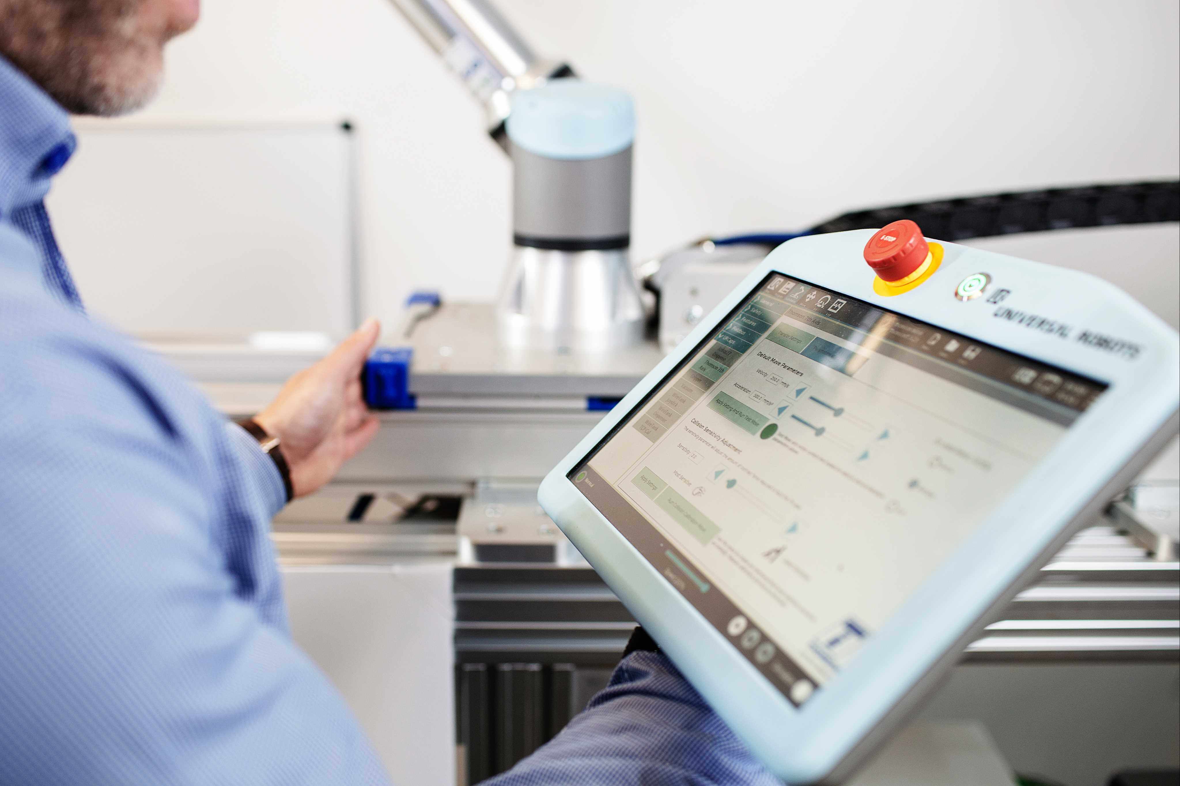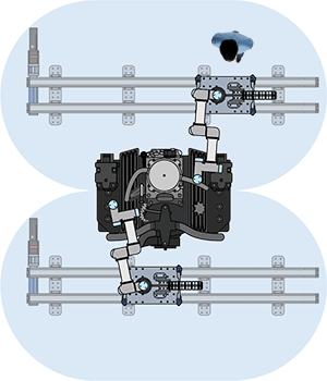 Includes: Dual linear units, Kollmorgen servo motor, precision gearhead, carriage mounting plate for robot, Freedrive paddles, end-of-stroke limit switches, cable management, control box and software with 7th axis collision detection. For Universal Robots, a URCap is available for programming directly on the UR Teach Pendant.