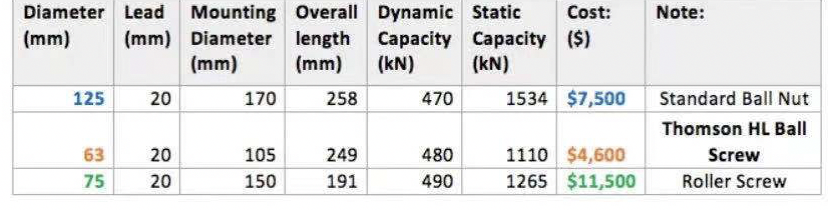 標(biāo)準(zhǔn)配置的滾珠絲杠可以解決這個(gè)問(wèn)題,但是它的直徑是高負(fù)載滾珠絲杠的兩倍,而且價(jià)格同比高出63%。滾柱絲桿也有該負(fù)載能力,但相對(duì)于高負(fù)載滾珠絲杠,螺母尺寸大50%,價(jià)格高出150%。