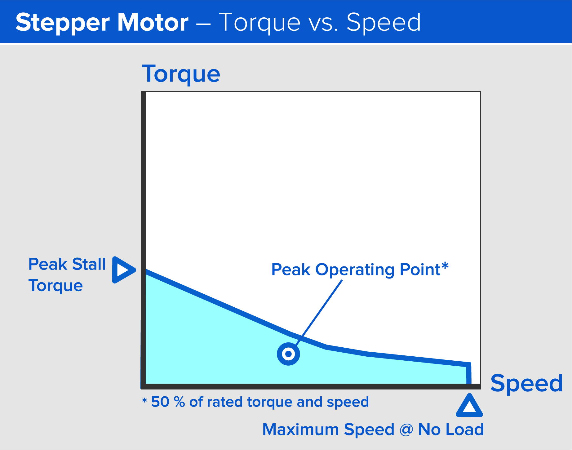 Figure 2: Torque vs speed - stepper motors. The operating range of a stepper should be about half of the max of the speed and torque. Image courtesy of Thomson Industries, Inc.