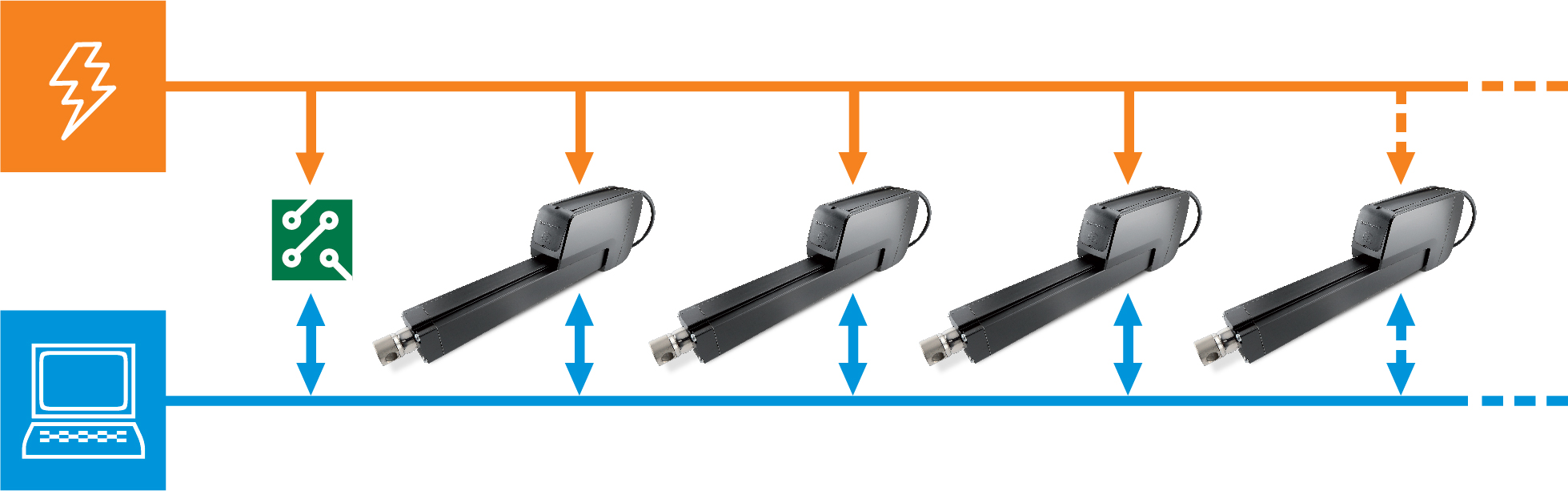 Image 1: Typical CAN bus network architecture. With just two wires for power (orange line) and two for network communications (Blue Line), smart actuators provide efficient, compact communications with each other and other devices (green box). (Image courtesy of Thomson Industries, Inc.)