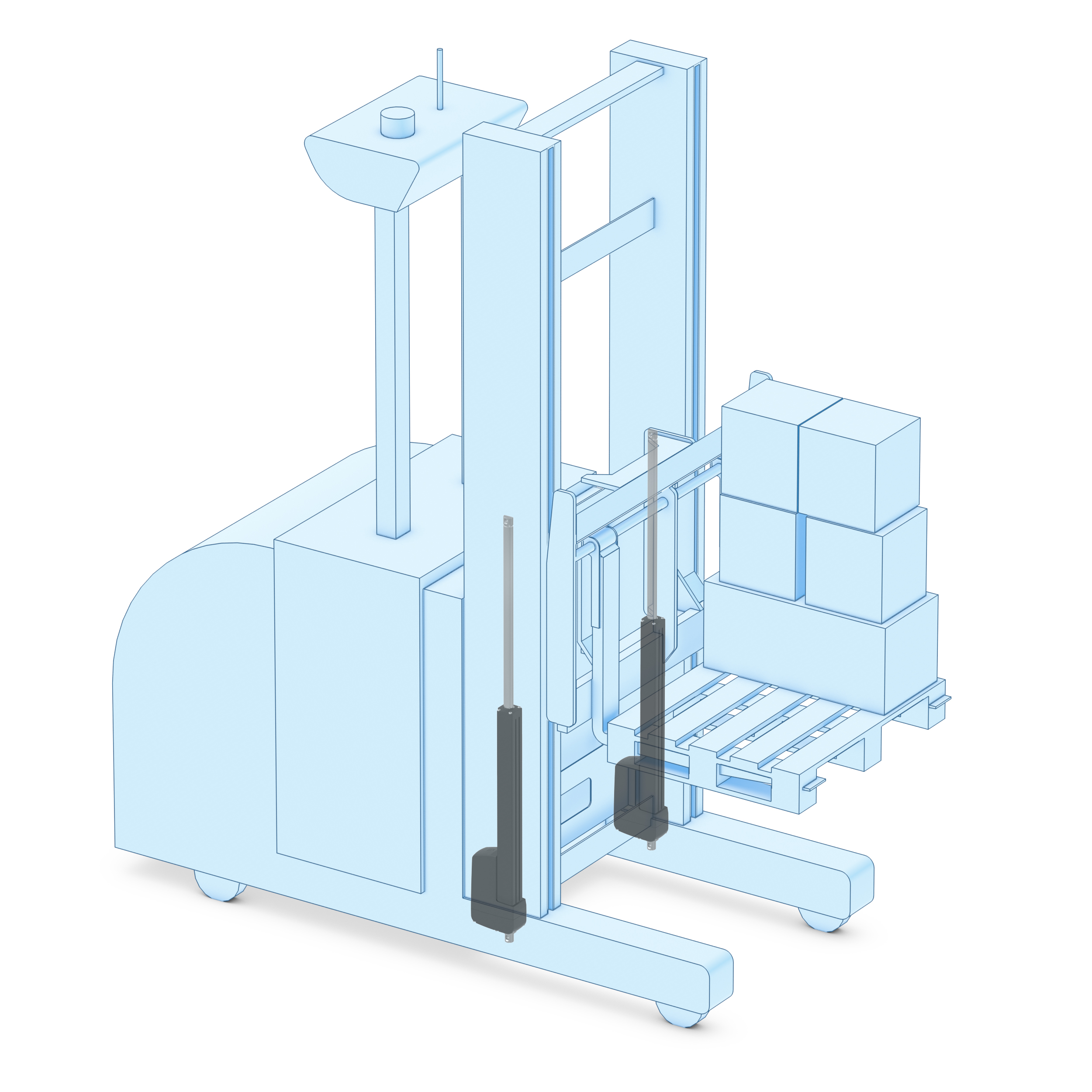 (Image 2) Synchronization, an option with Thomson offered by some manufacturers on smart electromechanical actuators, allows designers to achieve a balanced load for their machines no matter how awkward it may be. (Images of courtesy of Thomson Industries, Inc.)
